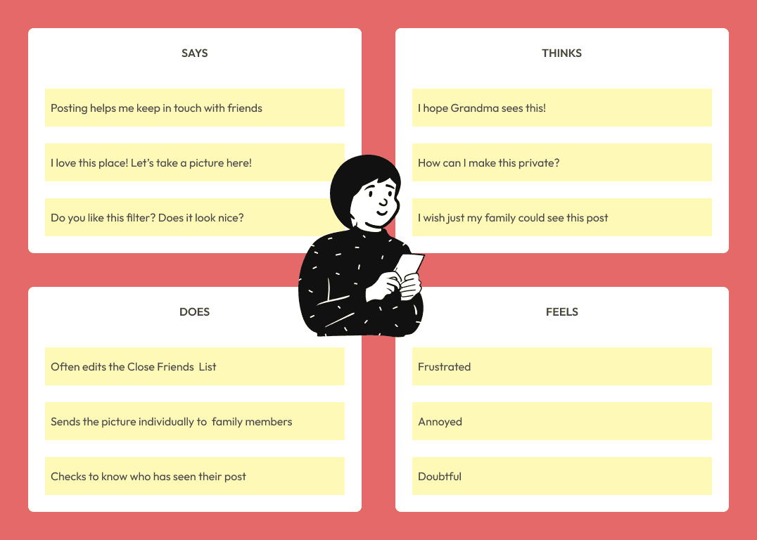 After defining the user persona and analyzing the gathered information, I identified Ava's main pain points related to sharing.