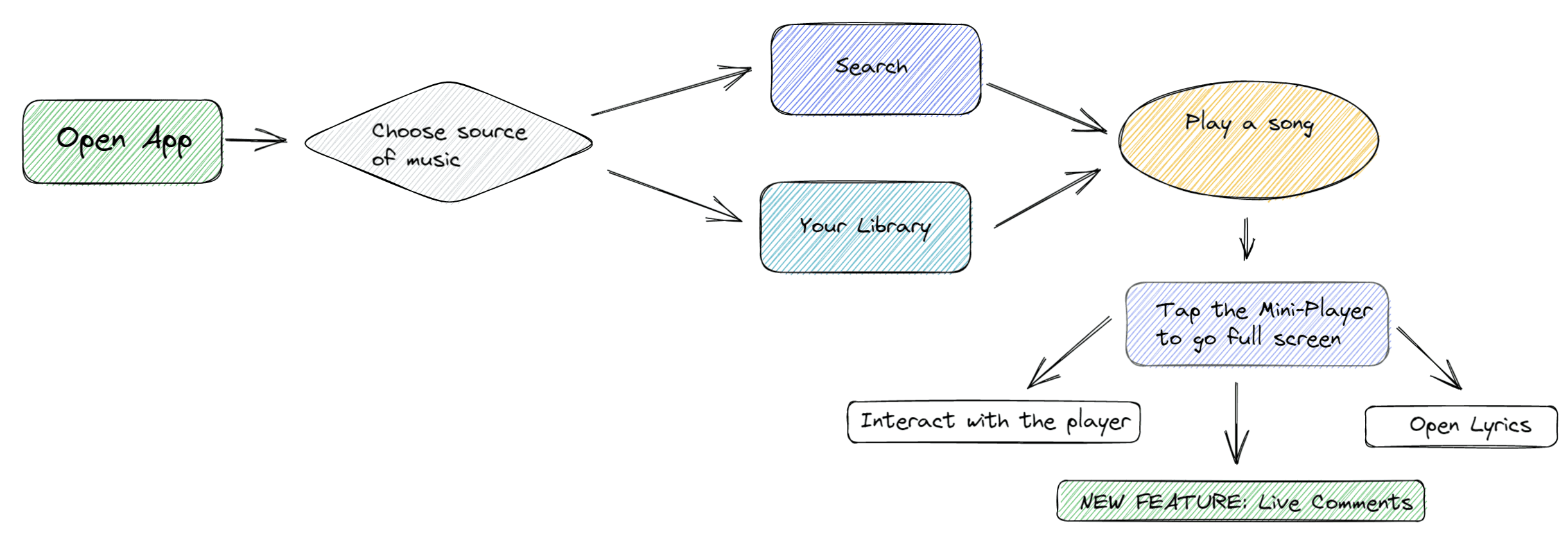 To determine where to locate the new feature, I designed a task flow that would help me visualize and identify the steps Jessica and Mark take to listen to music on Spotify so that I could choose a clear place for the solution, as it is an existing product.